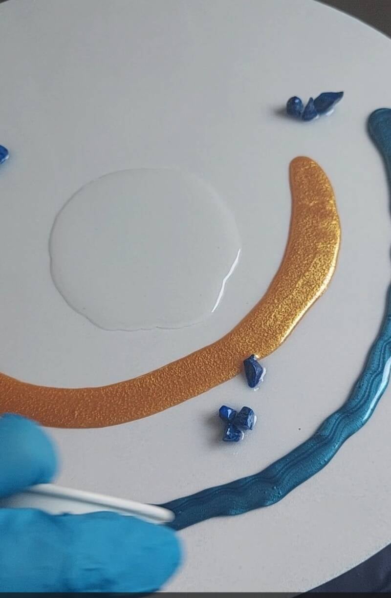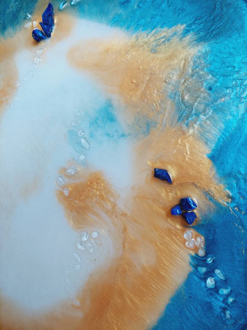 De schilderijen worden intuïtief gemaakt. In elk schilderij heeft 1 edelsteensoort de hoofdrol. Door het mengen van kleuren in epoxyhars ontstaan bijzondere patronen en een mooie glans. De hars sluit de edelstenen in. In de patronen krijgen kleinere edelstenen een bijrol. Maar je zult zien, de bijrol is net zo belangrijk als de hoofdrol. Ze maken deel uit van 1 geheel.