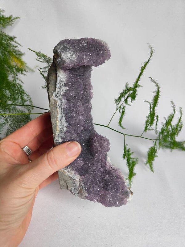 Amethist uit Uruguay op standvlak. Deze Amethist viel ons gelijk op door de fijne kristallen die lijken op druiven.