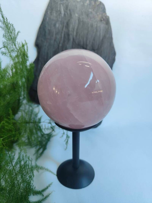 Rozenkwarts geslepen in de vorm van een bol. De roze kleur wisselt mooi af met lichte glinstering van lijnen.