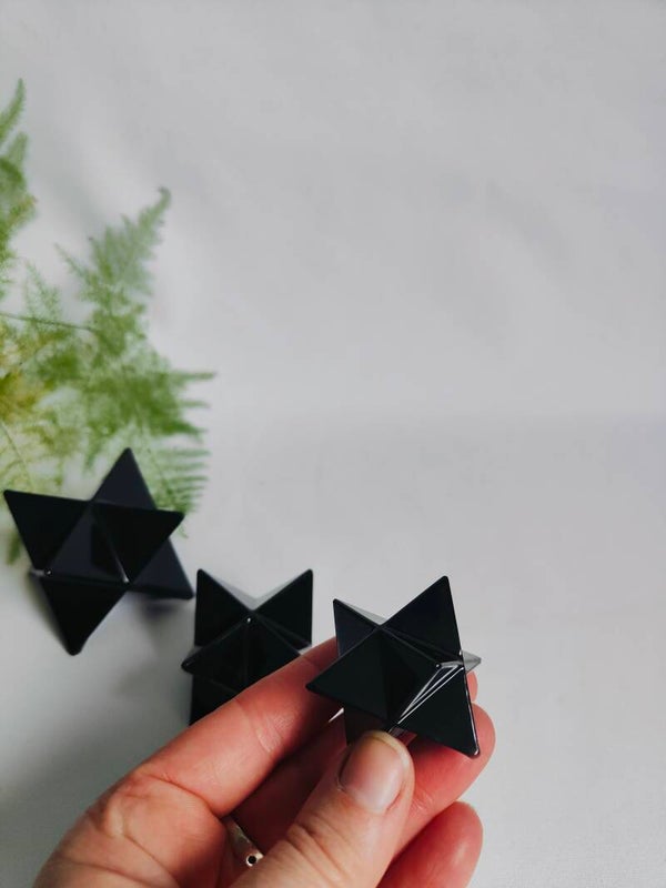 Deze Merkaba hebben we zelf gemaakt van Epoxyhars. In de Epoxy hebben we Shungite poeder verwerkt en er zit een Toermalijn steen in het midden.