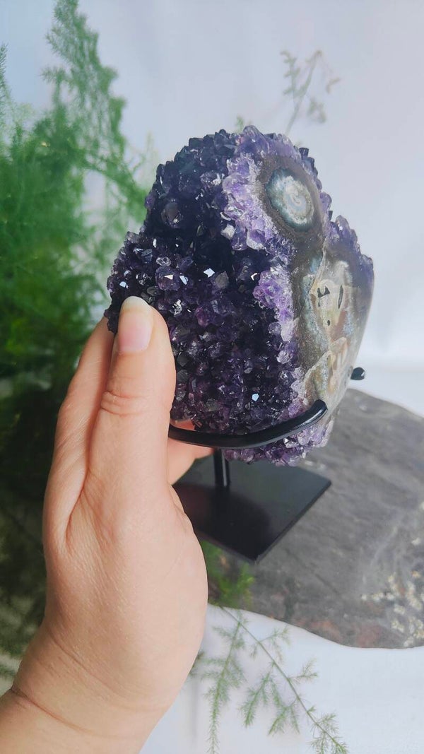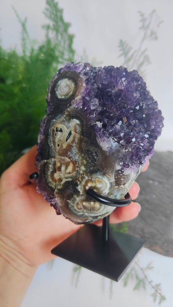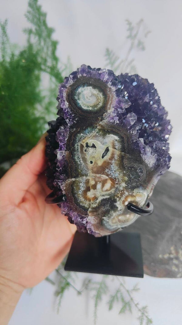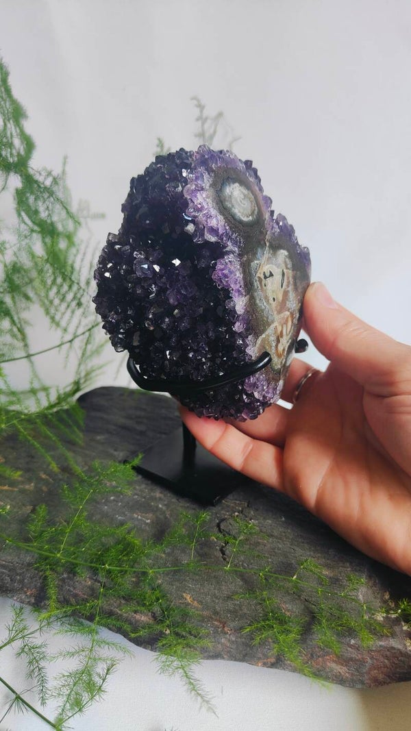 Een prachtig paarse Amethist die rechtstreeks uit een kleine mijn komt vanuit Uruguay. De Stalagtiet die op de Amethist groeide is er door de eigenaren afgehaald en gepolijst waardoor je een heel mooi effect op de voorkant hebt. Ze hebben deze mooie tekening omgedoopt als ICE. De zijkanten zijn mooi ruw en de voorkant is gepolijst.