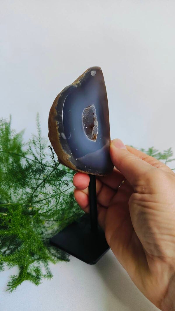 Een mooi en lieve kleine Agaat op standaard. Deze Agaat heeft mooie licht blauwe kleuren die overlopen naar het bruine. De achterkant is licht en robuust van kleur.