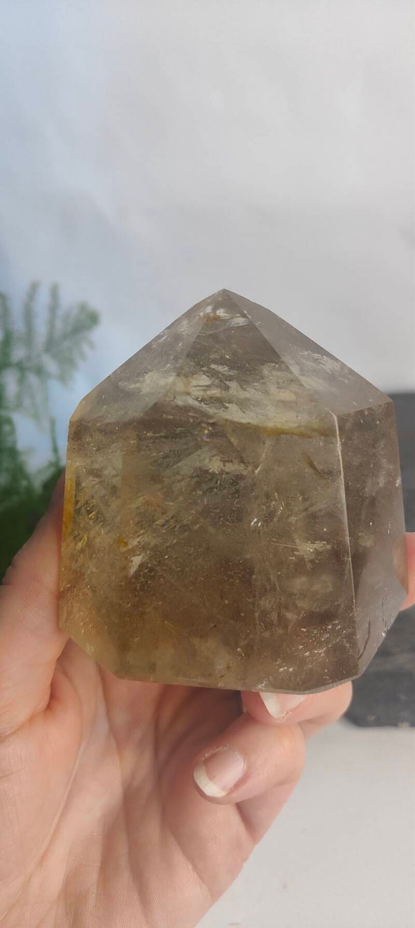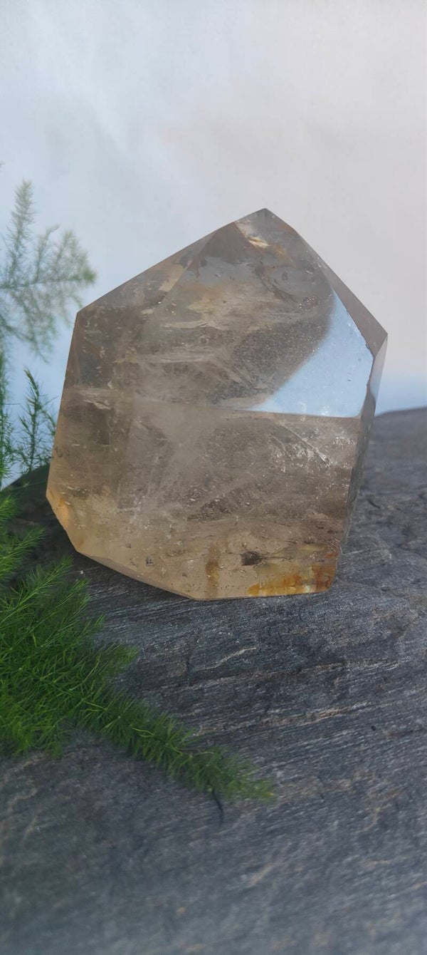 Deze Rookkwarts punt is de grootste uit de serie van 4. Hij is geslepen in een punt en de onderkant is ruw van vorm. Bij iedere kanteling geeft de steen een mooi kleurenpatroon, en soms een regenboogschakering.