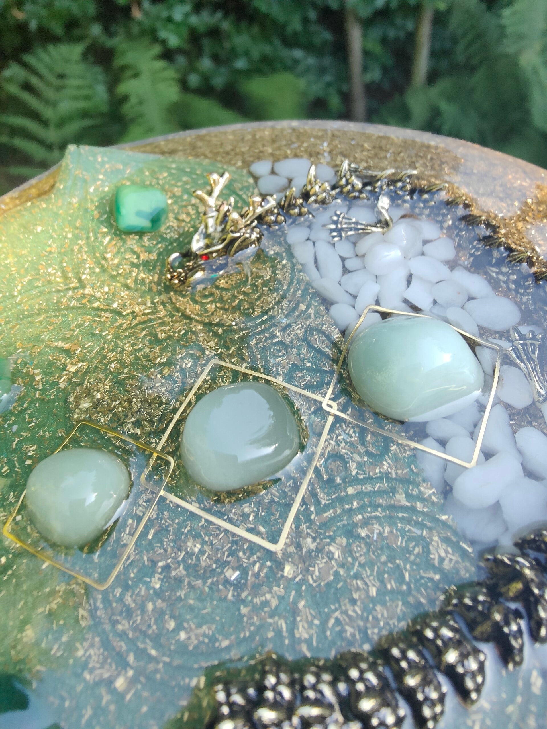 De gebruikte edelstenen zijn; Shungit poeder, Seleniet, Bergkristal, witte Jade, groene Jade, Nefriet en Apofyliet. Er zit koper, aluminium en messing in voor de metalen.