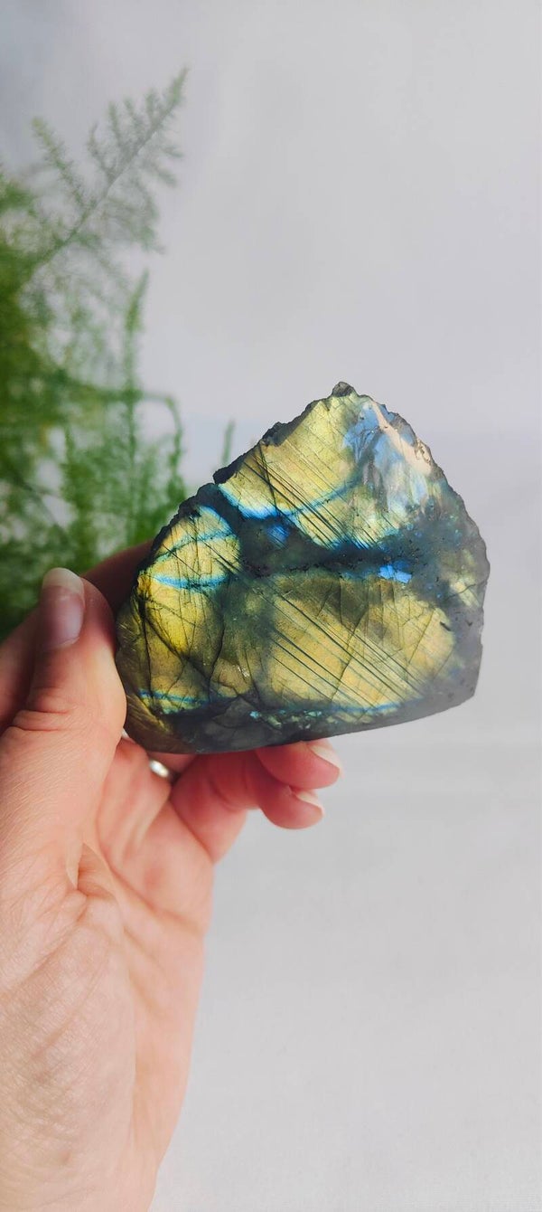 Edelsteen Labradoriet heeft een sterke iridescentie van goud tot blauw/groen. Door het draaien van de steen of door ander lichtval, licht een ander deel van de edelsteen op. Deze is aan de voorkant gepolijst en de achterkant is mooi ruw.