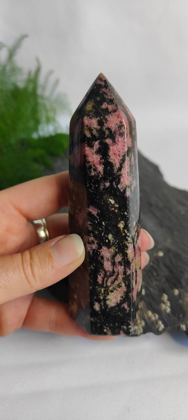 De prachtige Rhodoniet met zwart / roze tekening maakt de edelsteen erg decoratief. De edelsteen viel ons direct op, en bij het oppakken merkte je dat deze kleine krachtpatser je kan ondersteunen om te aarden.