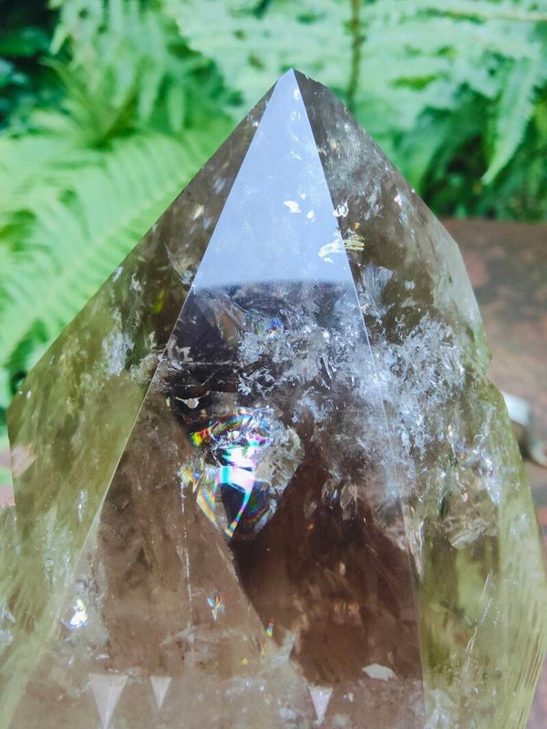 Een enorm en prachtige Rookkwarts punt. Zijn middel is ruw van vorm. In de punt zitten meerdere regenbogen die heel goed zichtbaar zijn, een echte eye-catcher.