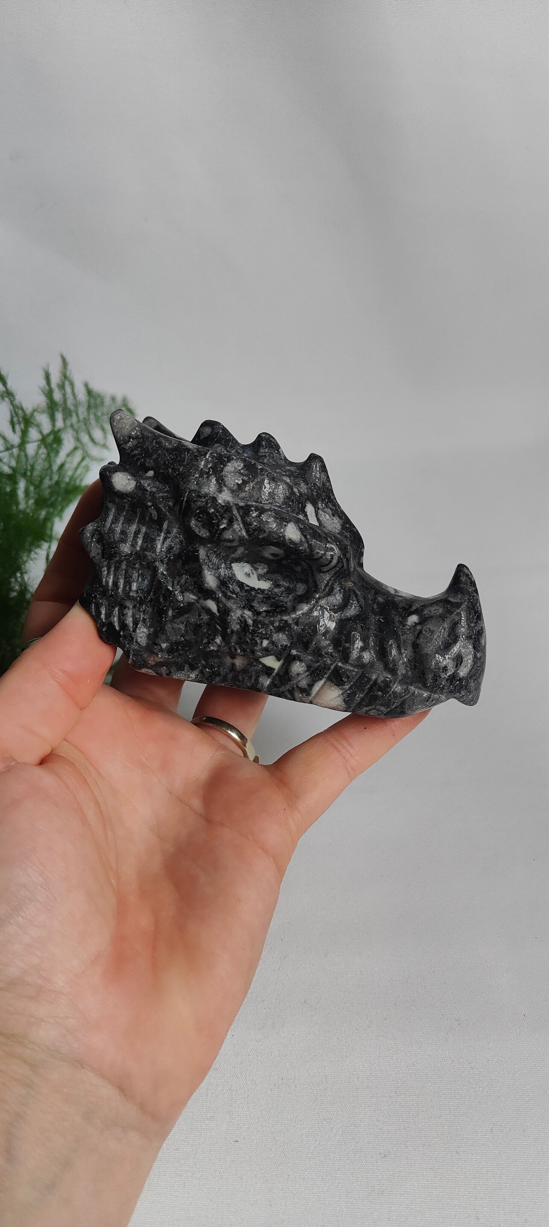 Orthoceras drakenkop met zeer fijne gedetailleerde lijnen en een stoer uiterlijk. Orthoceras is een fossiel en heeft ongeveer 400-500 miljoen jaar geleden bestaan.