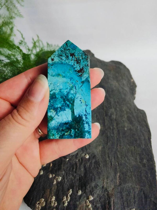 Chrysocolla ondersteunt je in de verwerking van fysieke pijn die kan ontstaan door emotionele problemen. Bovenal kan ze je ondersteunen in het proces te luisteren naar je eigen wil en stem. Ze helpt je in je vrouwelijke energie te komen staan.