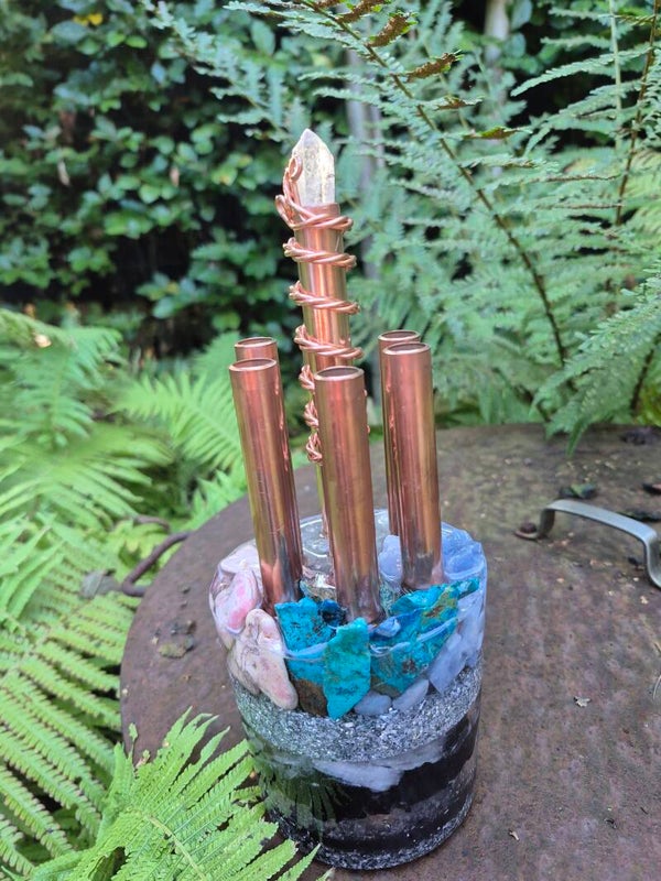 Phoenix steen, Rhodochrosiet, blauwe Calciet, Topaas, Bergkristal, Toermalijn, Seleniet, Aluminium, Koper en Messing.