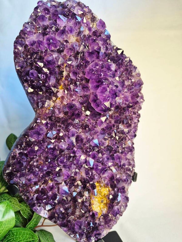 Een prachtige Amethist met diverse flower formaties op een industriele standaard. Je ziet onderin een lichte opbouw van Calciet.