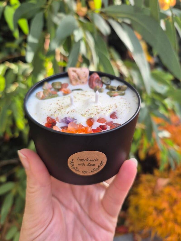 In de sierlijke zwarte kaarsenpot ontdek je Unakiet, rode Agaat, Rhodochrosiet en Bloedcarneool.