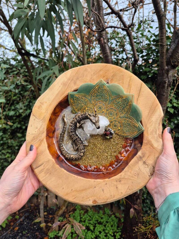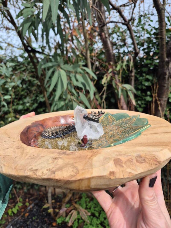 Teak houten krachtschaal Resin Art & Gems "Drakenenergie"