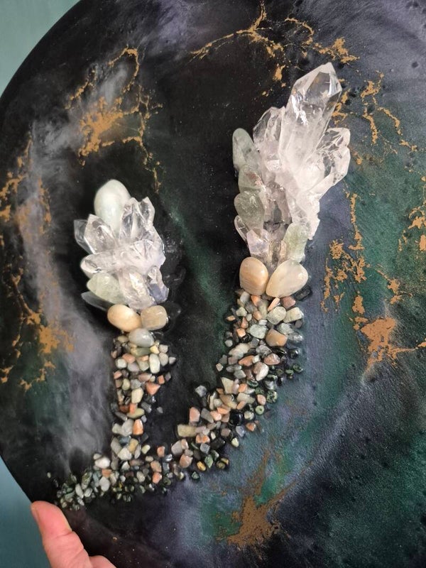 Epoxyhars gegoten op een houten schijf van 40 cm doorsnede. Met natuurlijke pigmenten en edelstenen is een patroon gemaakt.